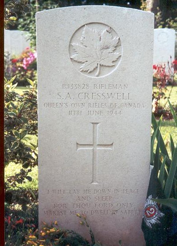 Rifleman Cresswell landed with D Company on Juno Beach, D-Day 6 June 1944 but was killed in action on 11 June 1944 during the battle for Le Mesnil Patry, aged 20.