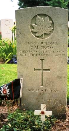 Rifleman Cross was killed in action on 26 February 1945, at the age of 19. Glenn was buried on 3 March 1945, at the Canadian Military Cemetery in Bedburg (near Kalkar). He lay in a temporary grave, plot I, row 15, grave no. 8. Glenn was reburied at the Canadian War Cemetery in Groesbeek on September 10, 1945, Grave VIII. D. 3.