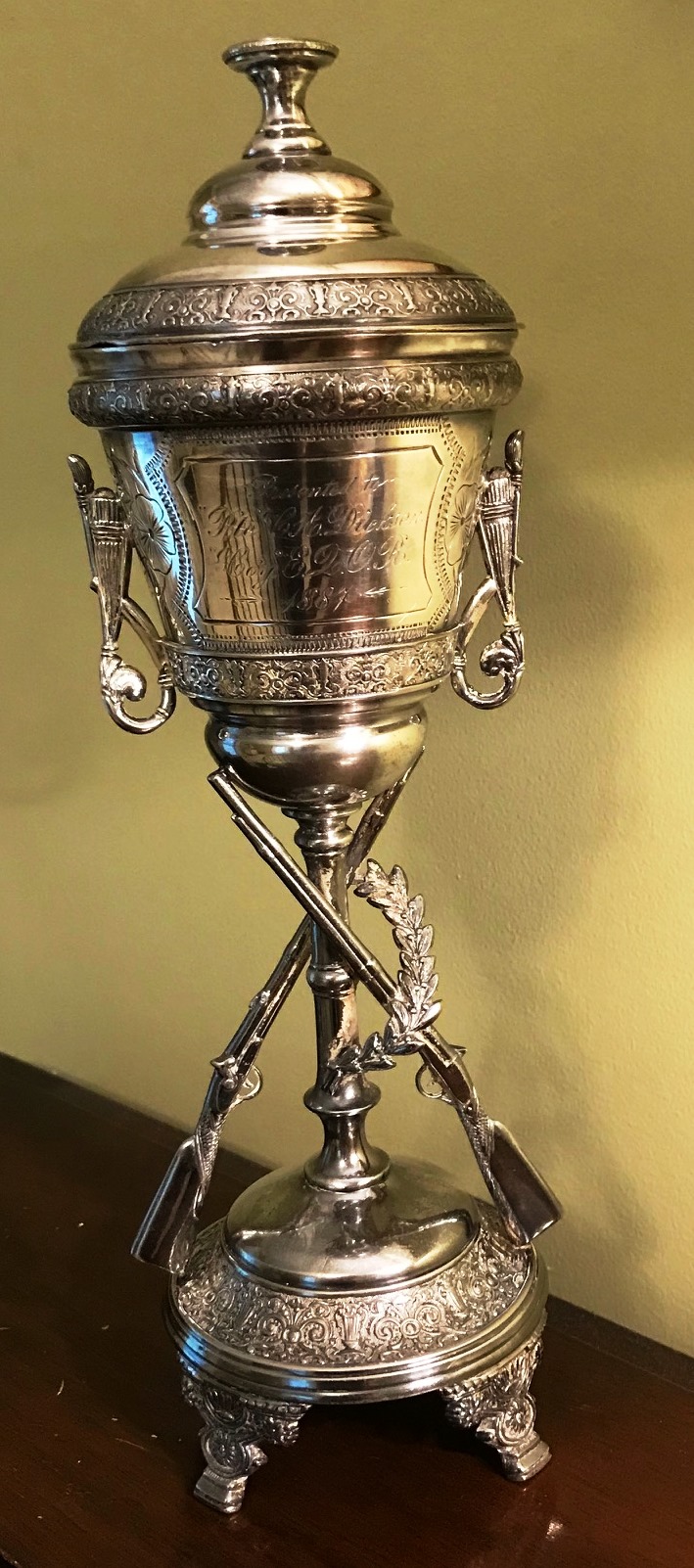 Clarence was presented a silver trophy by the regiment, likely for shooting, that was engraved “Presented to Pte C.A. Dickson Coy E Q.O.R. 1887” and as of 2019 was still in the possession of his descendants. (See photo below.)