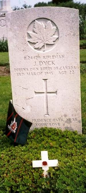 Rifleman Dyck was killed in action in Germany on 3 March 1945, aged 22. His severely decomposed body was recovered in a German trench by the Regimental Chaplain on 23 April and was only identified by his identify tags. He is buried in Groesbeek Canadian War Cemetery, grave reference XXI. D. 2.