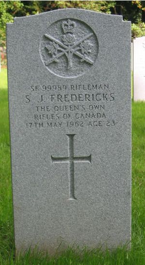Rifleman Fredericks was buried in the Werl Military Cemetery on 21 May 1962 with full military honours.