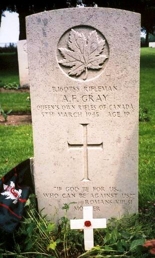Rifleman Gray was killed in action on 5 March 1945 aged 19. He is buried in Groesbeek Canadian War Cemetery, grave reference VII. F. 16.