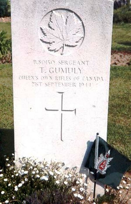 Sergeant Gumuly was killed in action near Boulogne, France on 21 September 1944 age 25. He is buried in the Calais Canadian War Cemetery, grave reference 6. B. 3.