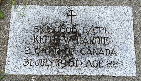 Lance Corporal Hardie died as a result of a motor accident in Calgary 31 July 1961. At the time of his death he was an NCO with the signal platoon. He was active in sports and had been a member of the team that won the 1961 Garrison Basketball Championship.