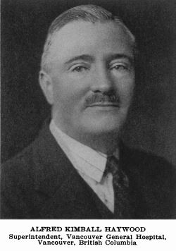 Major Dr. Alfred Kimball Haywood, OBE, MC was born 14 January 1886 in Toronto, Ontario, son of Alfred Haywood and Lola Kimball. He attended Upper Canada College from 1900 until June 1904, and received his MB from the University of Toronto in 1908.