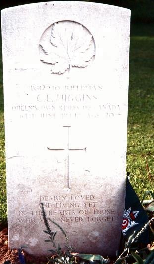 Rifleman Higgins landed on Juno Beach on D-Day, 6 June 1944 and was killed in action, aged 20. He is buried in Beny-sur-Mer Canadian War Cemetery, grave reference I. A. 13.