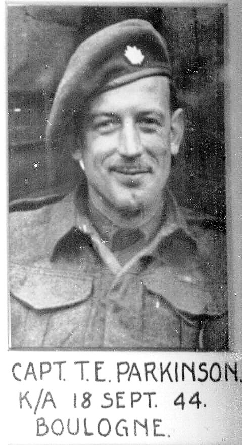 Captain Parkinson was killed in action near Boulogne, France on 18 September 1944, aged 35 and is buried in the Calais Canadian War Cemetery, grave reference 6. B. 12. His family chose the following epitaph for his grave marker: