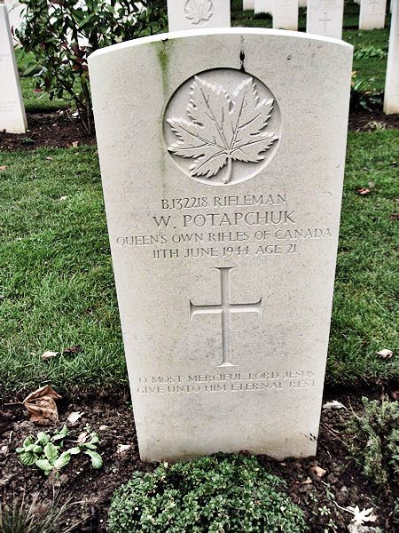 Rifleman Potapchuk landed with D Company on Juno Beach with the second wave on D-Day, 6 June 1944 however he was killed in action aged 21, during the battle for the village of Le Mesnil Patry on 11 June 1944.