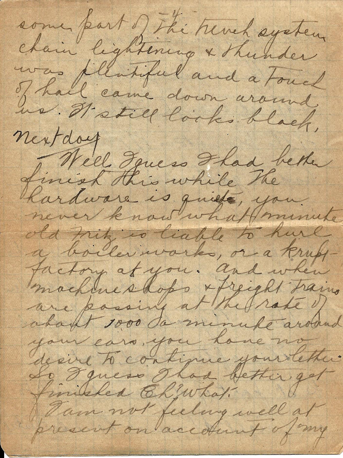 Pridham 1918 07 11-4 March 27, 2014 1409 × 1883 Pridham 11 July 1918 Page 4 of a letter from Lawrence Pridham to his Uncle Will (called Bill here) sent from France 11 July 1918 Share this: Click to email a link to a friend (Opens in new window) Email Click to print (Opens in new window) Print TweetMore Click to share on Telegram (Opens in new window) Telegram Click to share on WhatsApp (Opens in new window) WhatsApp PocketShare on Tumblr Click to share on Reddit (Opens in new window) Reddit Like Loading...