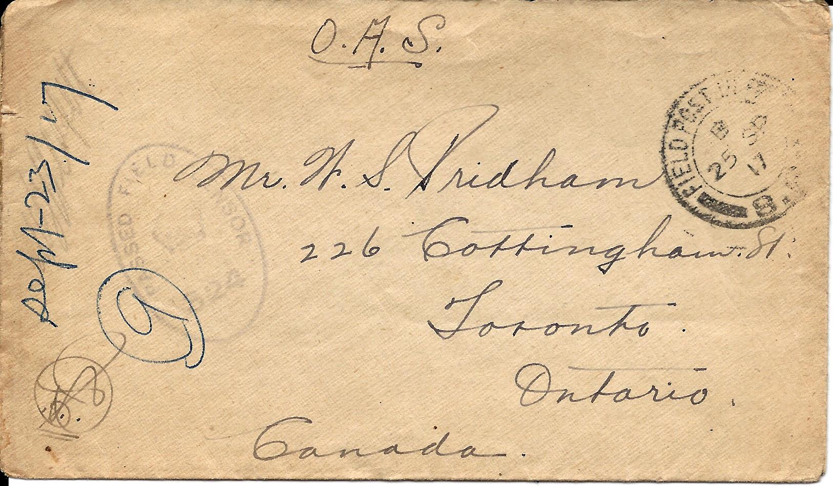 Pridham 1917 09 23-3 March 24, 2014 1626 × 948 Pridham 23 September 1917 Envelope cover of a letter sent from France 23 September 1917 from Lawrence Pridham to his Uncle Will in Toronto. Share this: Click to email a link to a friend (Opens in new window) Email Click to print (Opens in new window) Print TweetMore Click to share on Telegram (Opens in new window) Telegram Click to share on WhatsApp (Opens in new window) WhatsApp PocketShare on Tumblr Click to share on Reddit (Opens in new window) Reddit Like Loading...