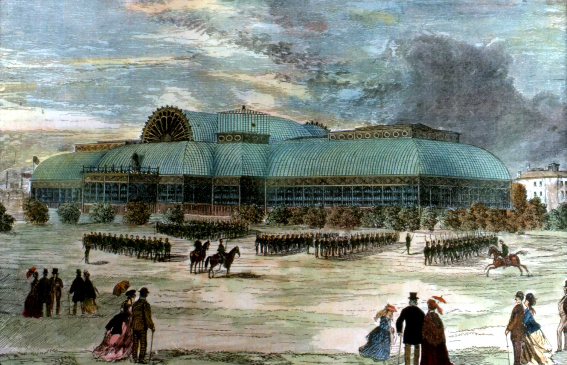 Crystal Palace in 1871 with what is likely companies of the Queen's Own drilling was located north west of King and Shaw streets was in use from 1858-1878