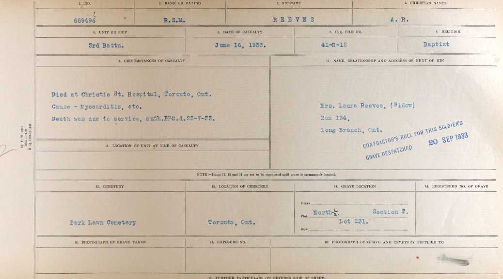 Reeves died 16 June 1933 at Christie Street Military Hospital of myocarditis which was attributed to his military service, and was buried in Park Lawn Cemetery, Toronto.