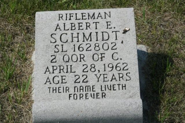 Rifleman Schmidt died suddenly in a diabetic coma in the Colonel Memburn Pavilion in Edmonton on 23 April 1962.