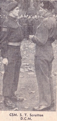 Scrutton served with The Queen’s Own Rifles during WWII and was awarded the Distinguished Conduct Medal 19 August 1944 (CG 34, p3546) for actions taken on 11 June. The medal was presented in the field by Field Marshall Montgomery 5 November 1944.