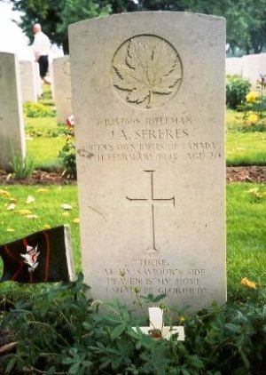 Rifleman Sereres was killed in action in Germany during Operation Blockbuster on 26 February 1945, aged 20. He is buried in Groesbeek Canadian War Cemetery, grave reference VIII. B. 12. His family had the following engraved on his marker: