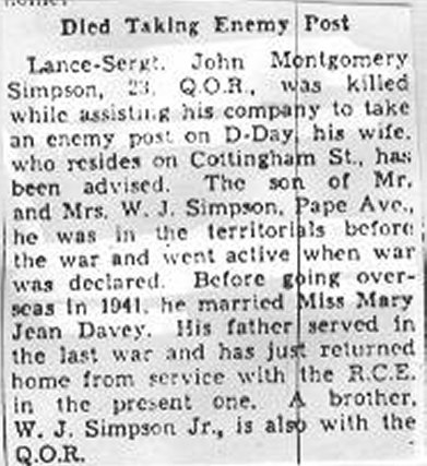 B63935 Lance Sergeant John “Jack” Montgomery Simpson was born December 9, 1920, the son of William John and Helen May Ormenta Lumley, of Toronto, Ontario. Shortly before going overseas, he married Mary Jean Davey, of Toronto.