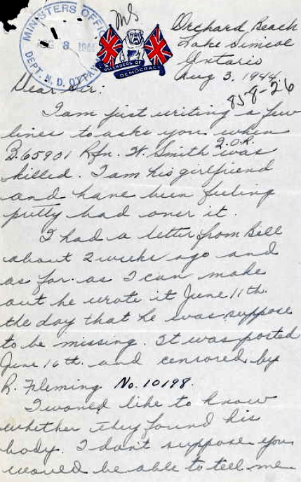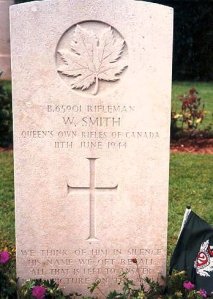 Smith was working for a building contractor in Sundridge, Ontario when he enlisted in Toronto with the 3rd Battalion, The Queen’s Own Rifles on 9 September 1942 and then trained at Camp Niagara and Debert, Nova Scotia. He appears to have lied about his age on attestation papers showing his birthdate as 1910 perhaps to avoid being considered too old to enlist.