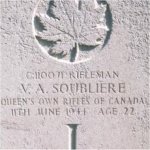 Rifleman Soublière landed with D Company on Juno Beach on D-Day, 6 June 1944. He was killed in action, aged 22, on 11 June during the battle for the village of Le Mesnil Patry.