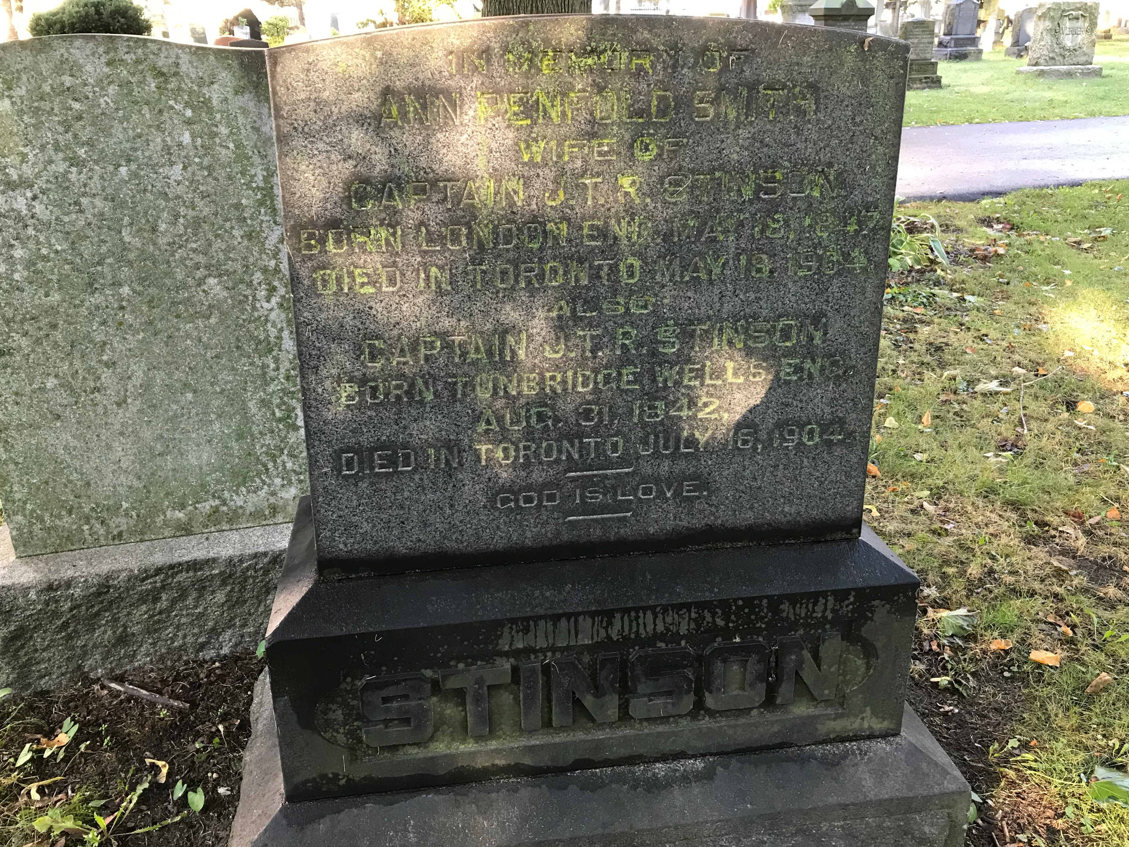 Captain John Theophelus Richey Stinson was born 31 August, 1842 in Tunbridge, Wells, England to Joseph Henry Stinson and Hannah Day Chette. By 1861 the family had emigrated to Toronto, Canada West and were living at 12 Jarvis Street.