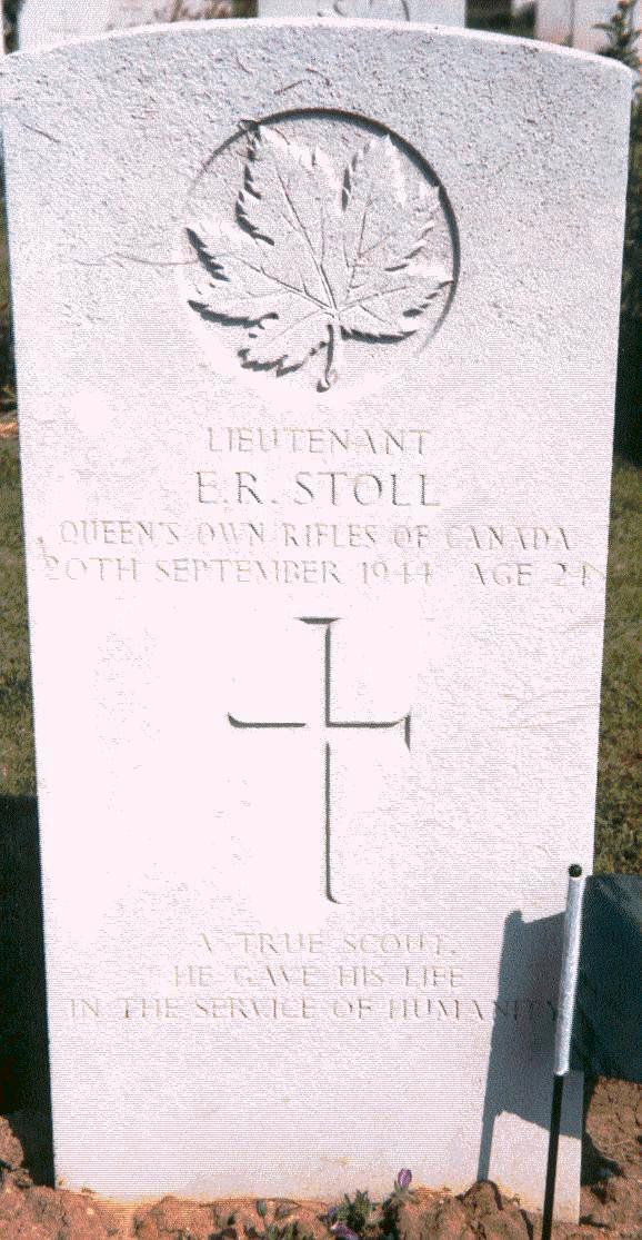Lieutenant Stoll was wounded in action near Boulogne, France on 19 September and died on 20 September 1944, aged 24. He is buried in the Calais Canadian War Cemetery, grave reference 6. A. 7. His will left everything to his father (his mother had died before he enlisted.)