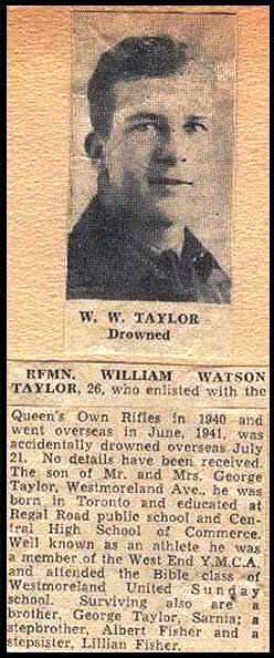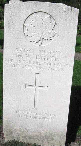 B64259 Sergeant William Watson Taylor was born in Toronto on 15 March 1921. He was the youngest son of George and Mary Jane Taylor both of whom were born in England and immigrated to Canada in 1910. Sadly, his mother died of a cerebral hemorrhage when he was only 12. William had one older brother, George, born in Canada in 1912.