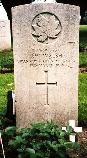 Lance Sergeant Walsh was killed in action in Germany on 3 March 1945, aged 27 and was later re-buried in Groesbeek Canadian War Cemetery, grave reference VII. F. 14.