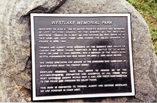The Westlake brothers are also commemorated with a plaque in a Toronto park near their home which was renamed in their honour on 9 June 1996.