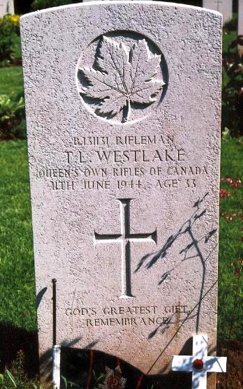 Thomas was the brother of Private George Westlake, who died while serving with the North Nova Scotia Highlanders and of Rifleman Albert Westlake, who served with Thomas in The Queens Own Rifles of Canada and died on the same day, in the same battle. (He also had two other living brothers and three more had died in infancy.)