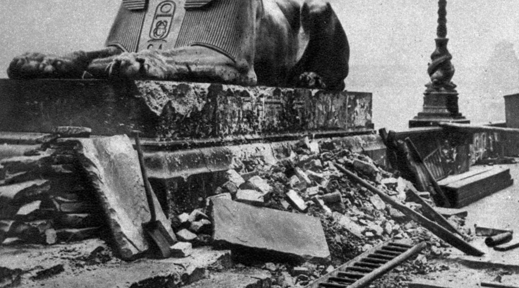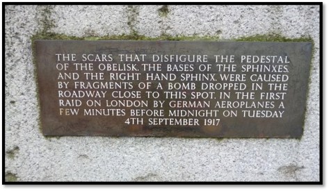 Three more bombs fell in quick succession from the Gotha as it completed its run between the Strand and the Victoria Embankment roadway along the Thames. Alfred Buckle was driving his single-decker Tram along the embankment when he heard the explosions and sped up with the hope of sheltering in the Kingsway Tunnel, but his tram sustained a near direct hit as he passed the Cleopatra’s Needle monument. The blast killed two passengers and mortally wounded Buckle. Witnesses reported that despite having his leg blown off, he stayed at the controls and applied the stop lever before succumbing to his wounds. Cleopatra’s Needle and the nearby Sphinx were heavily damaged by the blast and still bear the scars to this day from the explosion that killed tram driver Buckle and two passengers. Captain Rudolf Kleine’s night raid on London had killed 16 and wounded another 56 but one Gotha was shot down by anti aircraft fire and disappeared into the River Medway.