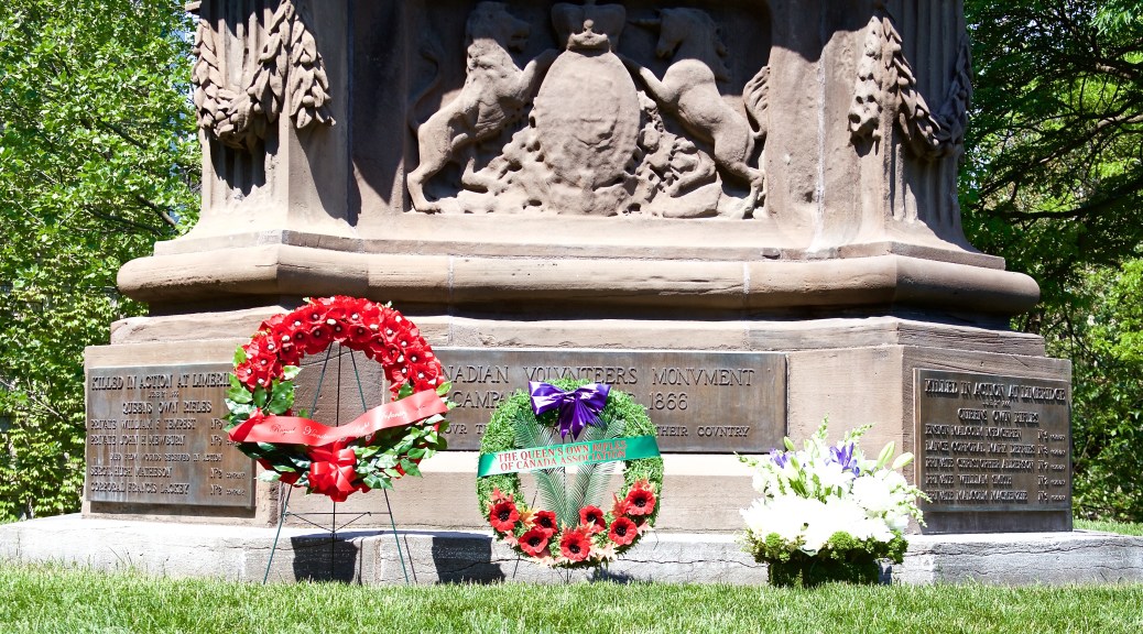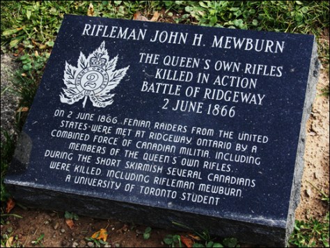 The Fenian intelligence was excellent. They knew that the northern force was mainly British regular soldiers while the southern force was untried Canadian Militia. They chose to attack the 841 Militia at Ridgeway first, then the British regulars. The ill-equipped and relatively untrained Militia troops attacked aggressively. A ‘cavalry’ alarm caused the Canadians to form square (a Napoleonic War tactic still in the British Drill Book) in front of trained American infantry, resulting in many fatalities and injuries. Nine men died that day from the QOR with others in the weeks following. Perversely, the error in command probably saved lives since the QOR and the 13th Battalion were just about to engage the Fenian main force with insufficient ammunition. The experienced and well-supplied Fenians would have cut them to pieces. The battle at Ridgeway was a tactical defeat for the Canadians, yet a strategic victory, since the Fenians withdrew back to the USA the next day after the US Government cut off reinforcements and supplies to the Fenians.