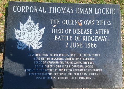 Eight months later, the Department of Militia and Defence in Ottawa also recognized Lockie’s contributions. There is a post in the Canada Gazette on June 1, 1868 noting that Thomas E. Lockie, “Queen’s Own Rifles, died of disease contracted at the Battle of Ridgeway” and that his widow had been awarded a gratuity of $200.