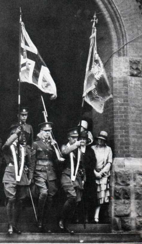 By around 1919, the UCC Cadets finally became compulsory, and principal Grant asked the army district headquarters if the Corps could be presented with Colours, both the King’s Colour and College Colour.  [Now Regimental Sergeant Major Carpenter also returned in 1919.] The College Colour was given by Elanor Gooderham in 1921.