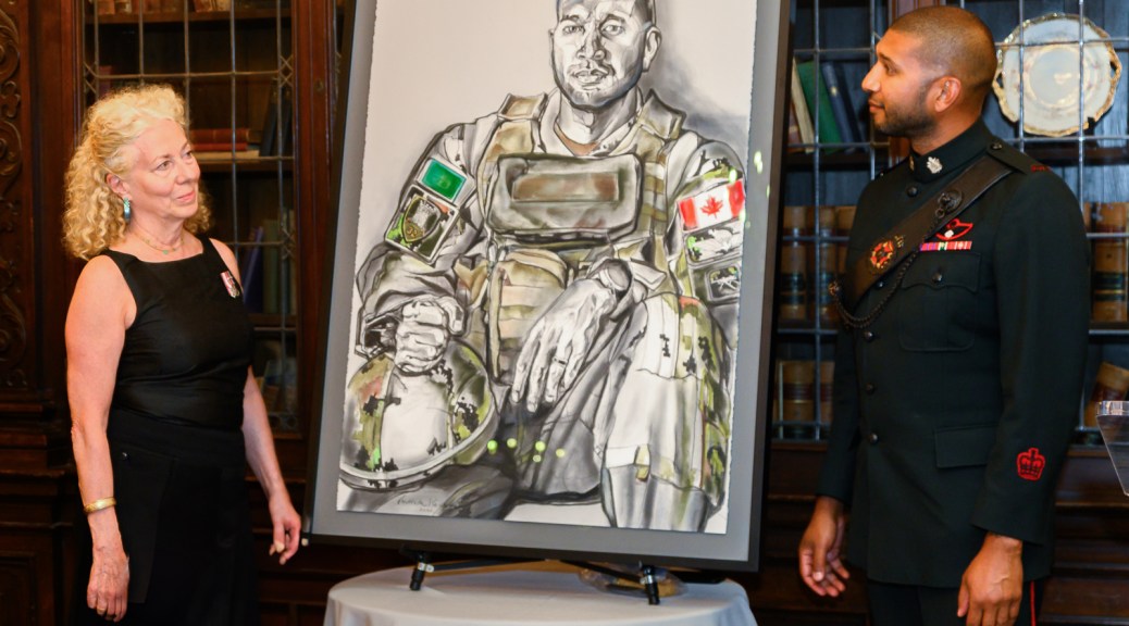 In the fall of 2022, the artist contacted our museum and very generously offered to donate the portrait to us. After a few delays, Curator Shaun Kelly picked up the piece earlier this year from Ms. Kearns’ studio. He then arranged to have the portrait framed and covered with museum-grade plexiglass to protect it while on exhibit. On 6 June 2023 at the D-Day Dinner at Casa Loma, Ms Kearns and Warrant Thomas unveiled the donated portrait. On the following Thursday our museum team hung the portrait for exhibit in our 1945 to Present Room.
