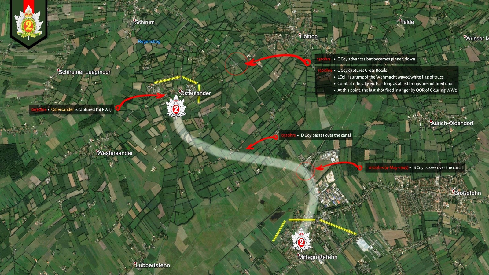 With this the combat of the 1st Battalion Queen’s Own Rifles of Canada came to an end for the Second World War. A German Lieutenant Colonel named Harms accompanied by the Burgomaster, traveled from the direction of Aurich. They approached Charlie Company’s lines under a flag of truce to negotiate the surrender of Aurich. At 2000 hours the Battalion learned of the unconditional surrender of all German forces facing the 21st Army Group in Northwest Germany, Holland, the Friesian Islands, Heligoland, Denmark and all ships of the German Navy adjacent to the German General Staff Headquarters. Ceasefire was to begin officially at 0800 hours the following morning, 5 May 1945.
