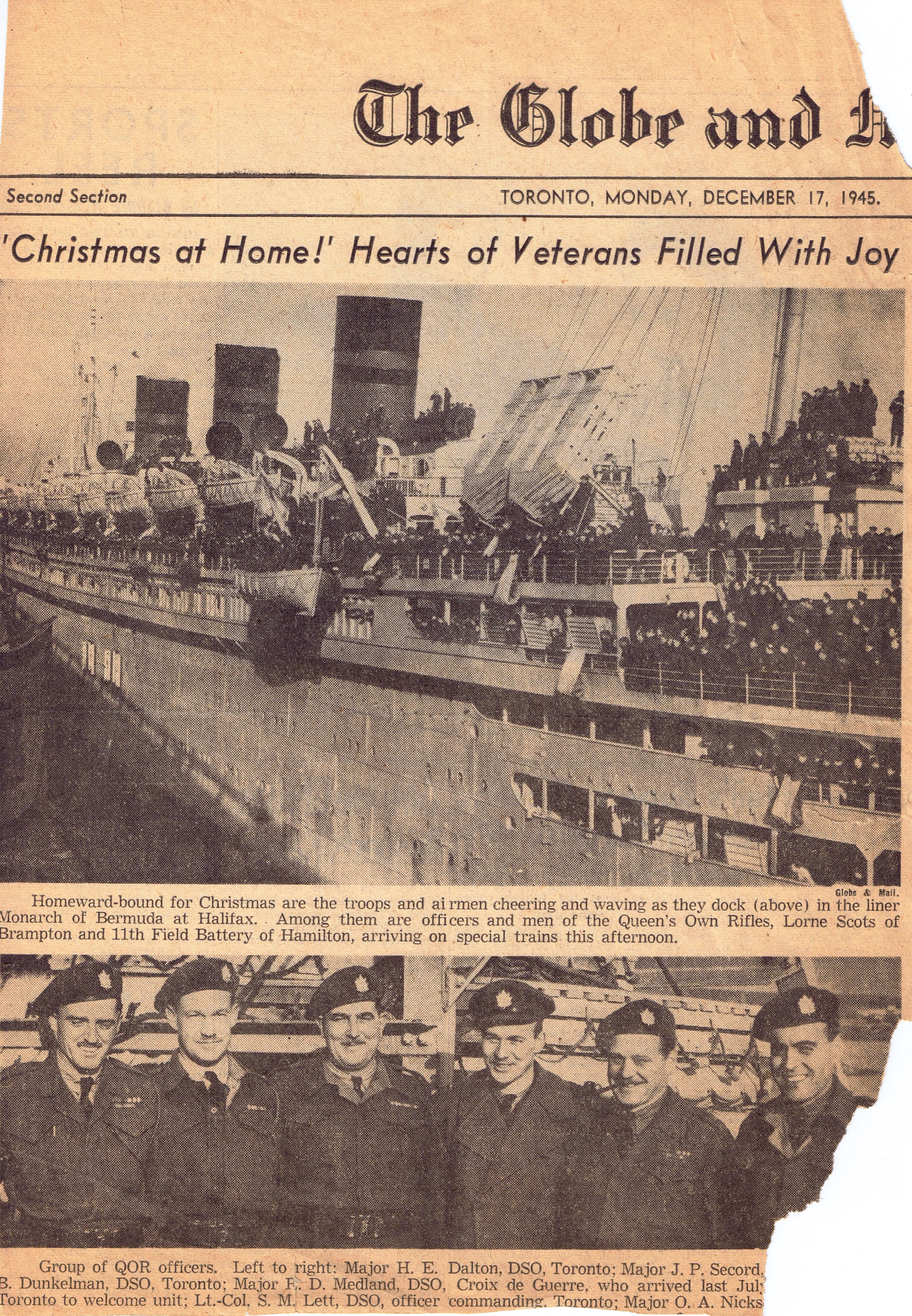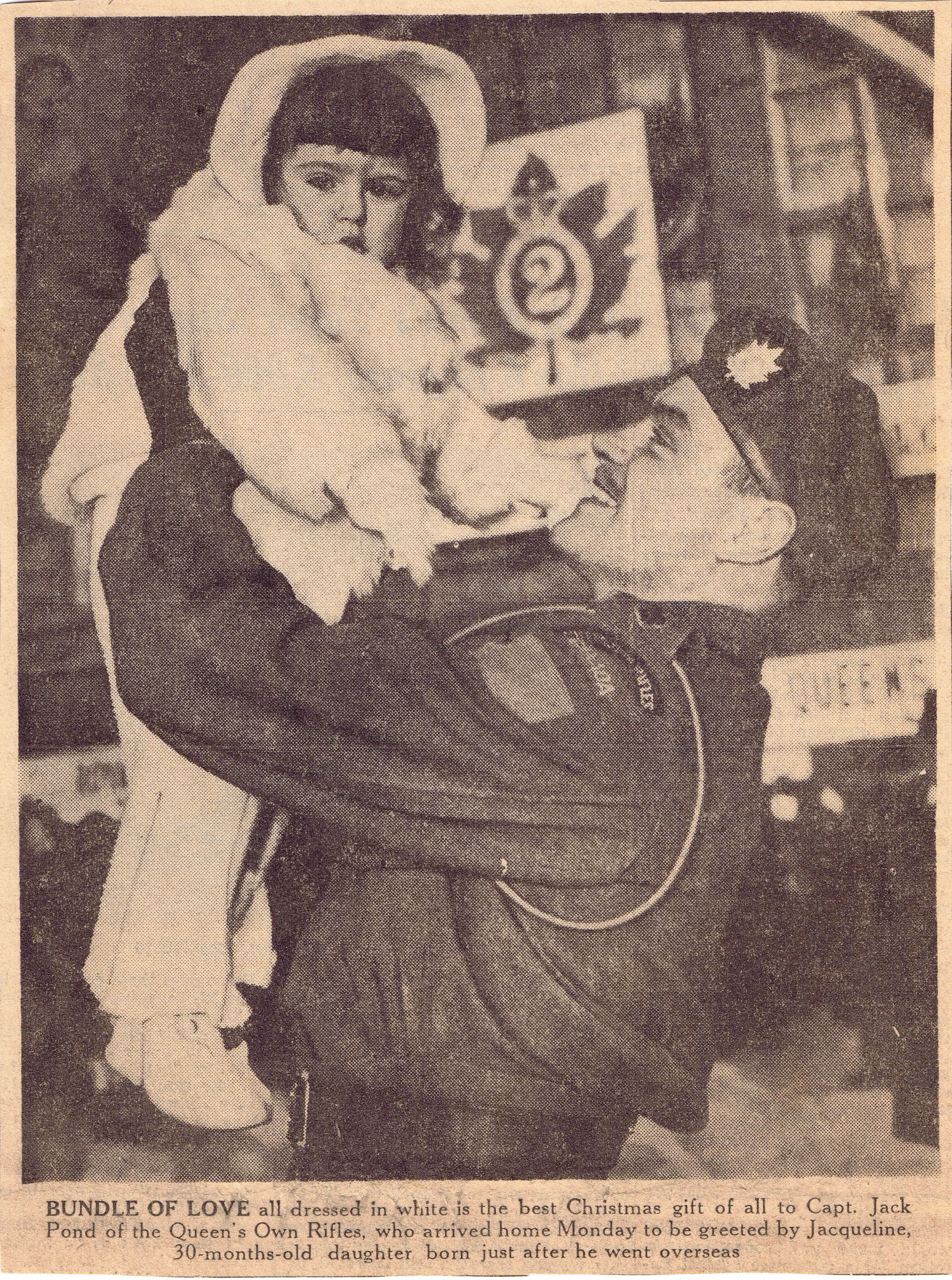 Turning in Rifles at the end of hostilities – June 1945Arriving Home, Monarch of Bermuda, Halifax Dec 17, 19451st Battalion QOR walking out of the north side of Union Station on arriving back in TorontoCaptain Jack Pond arriving home after the war greeting his daughter.